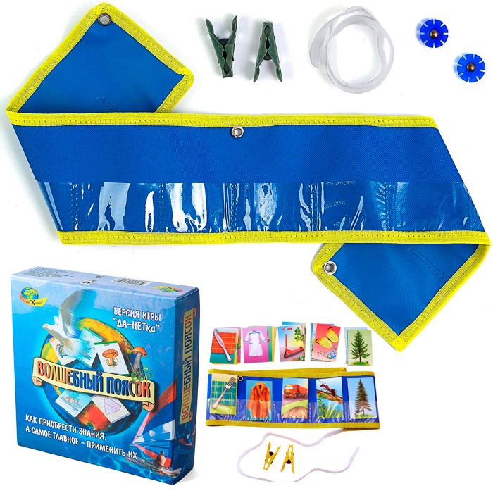 Состав: поясок с десятью кармашками, 50 тематических карточек, прищепки, липучка.