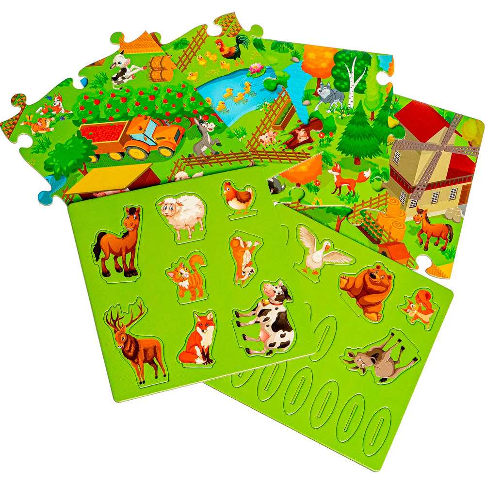 Комплектация: 4 карточки-пазлы, 12 фигурок животных с подставкамиМатериал: картон