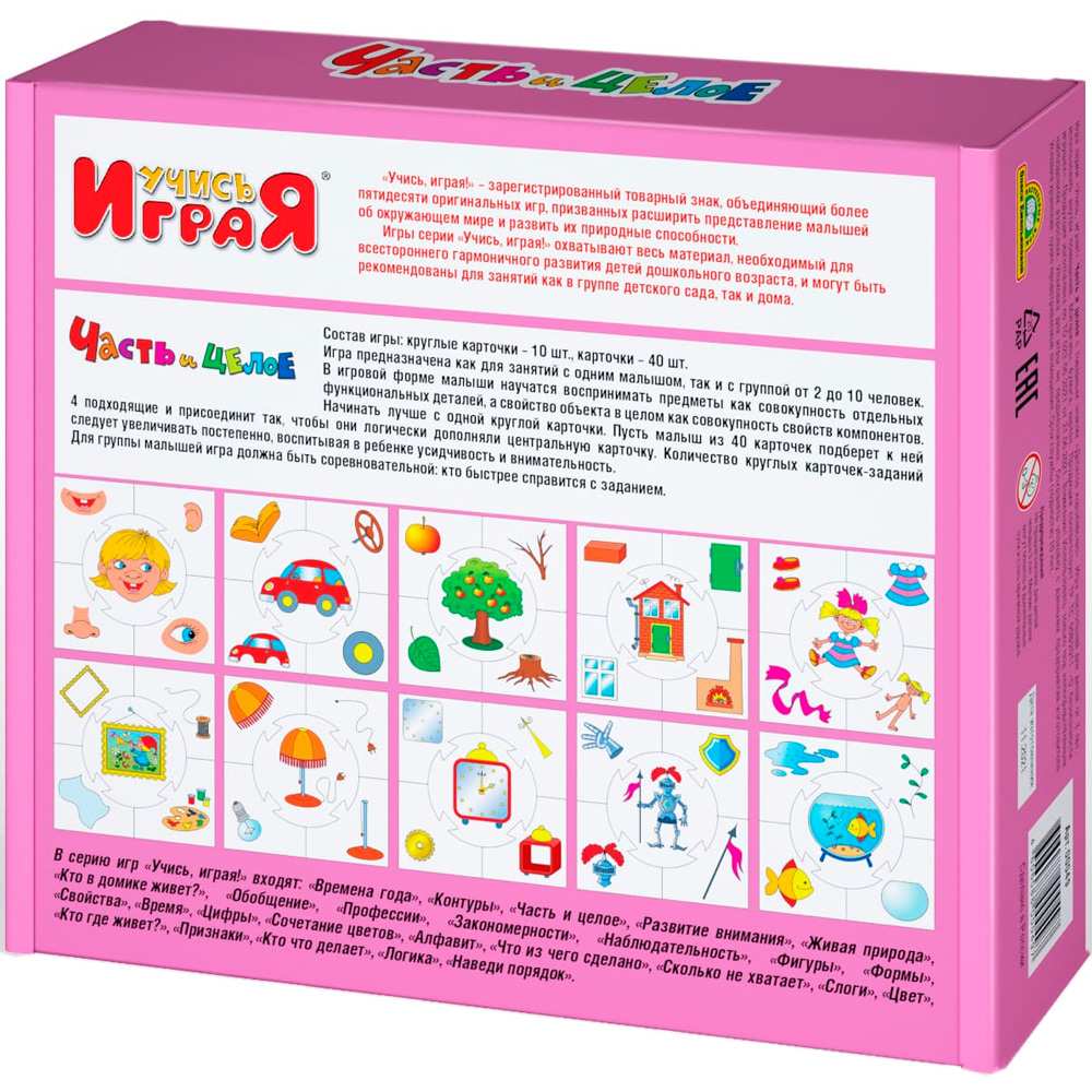 Игры серии "Учись играя!" охватывают весь материал, необходимый для всестороннего гармоничного развития детей дошкольного возраста, и могут быть рекомендованы для занятий как в группе детского сада, так и дома. В игровой форме малыши научатся классифицировать объекты по различным признакам, искать общее и различное, часть и целое. Такие игра развивают мышление, интеллект, память и внимание, логику, мелкую моторик и координацию. Они надолго увлекут любознательного малыша и принесут несомненную пользу для его гармоничного развития.