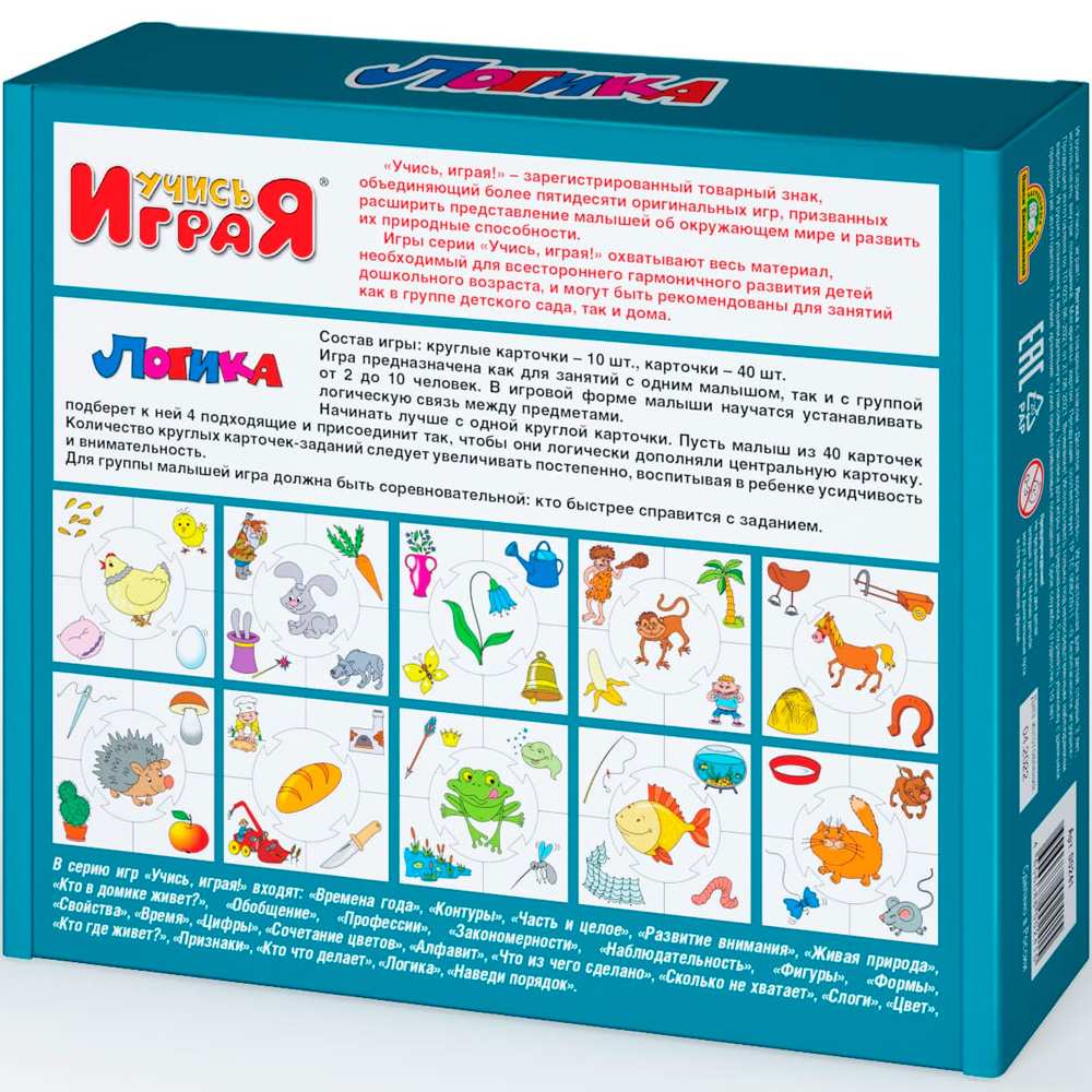 Игры серии "Учись играя!" охватывают весь материал, необходимый для всестороннего гармоничного развития детей дошкольного возраста, и могут быть рекомендованы для занятий как в группе детского сада, так и дома. В игровой форме малыши научатся классифицировать объекты по различным признакам, искать общее и различное, часть и целое. Такие игра развивают мышление, интеллект, память и внимание, логику, мелкую моторик и координацию. Они надолго увлекут любознательного малыша и принесут несомненную пользу для его гармоничного развития.