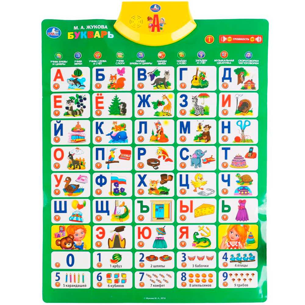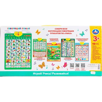 Яркий, красочный плакат будет отличным подарком. Плакат познакомит малышей с алфавитом, поможет разучить стихи и песенки. Он представляет собой наглядное пособие для детей. Яркое изделие содержит кнопки, нажав на которые можно услышать звуки, мелодии. Плакат наглядно демонстрирует материал. Развивает память и пространственное мышление ребенка, знакомит его с окружающим миром. Он поможет ярко, весело, а главное, наглядно показать информацию.