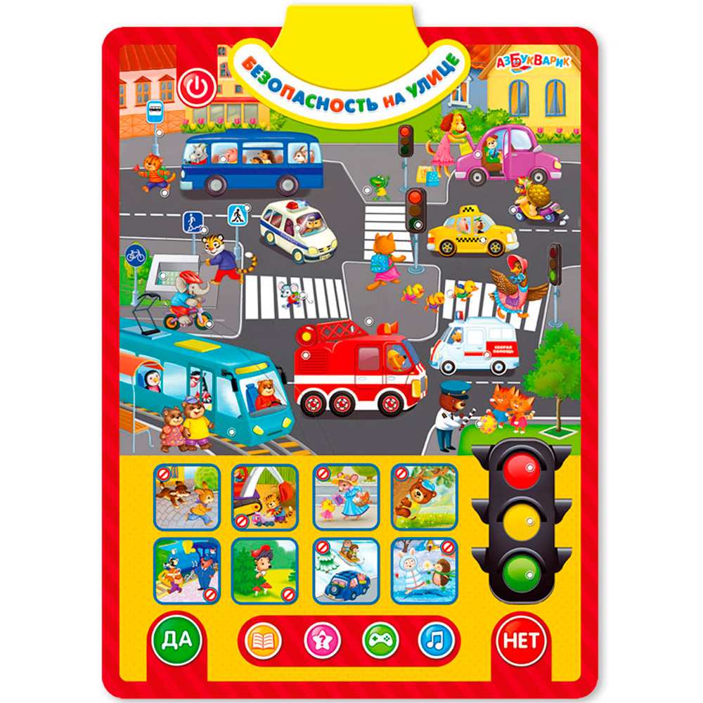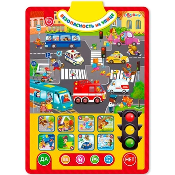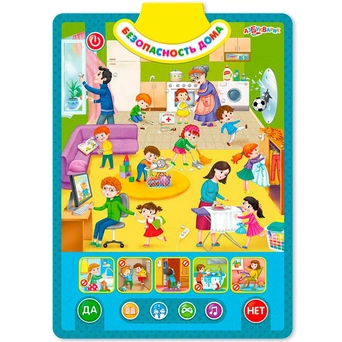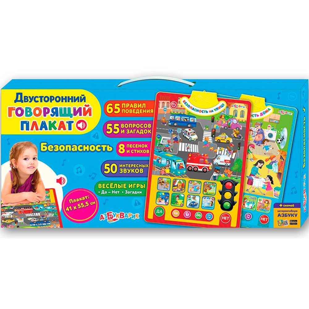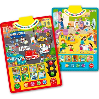 Правила безопасности важно знать всем детям. С этим двусторонним плакатом дети смогут изучить их в легкой игровой форме, нажимая на яркие говорящие картинки. Первая сторона – «Безопасность на улице», вторая – «Безопасность дома». Рассматривай забавные ситуации, изучай правила дорожного движения, слушай песенки, стихи и полезные советы от Саши и Даши.65 правил поведения, 55 вопросов и загадок, 50 интересных звуков, 8 песенок и стихов – всё это поможет детям провести время и весело, и с пользой! Плакат можно повесить на стену любой стороной или играть с ним, где удобно.