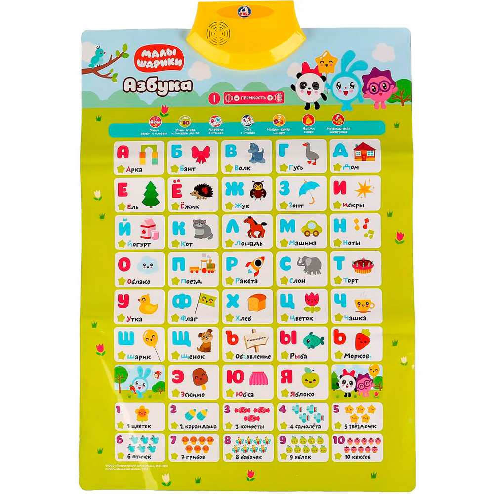 Плакат познакомит малышей с буквами русского алфавита, цифрами и счетом, поможет разучить стихи и песенки. Он представляет собой наглядное пособие для детей. Яркое изделие содержит кнопки, нажав на которые можно услышать звуки, мелодии, слова. Плакат наглядно демонстрирует материал. Развивает память и пространственное мышление ребенка, знакомит его с окружающим миром. Он поможет ярко, весело, а главное, наглядно показать информацию.