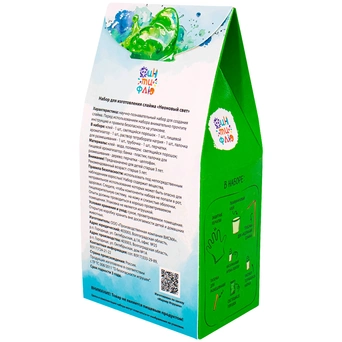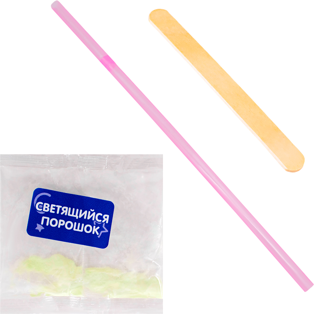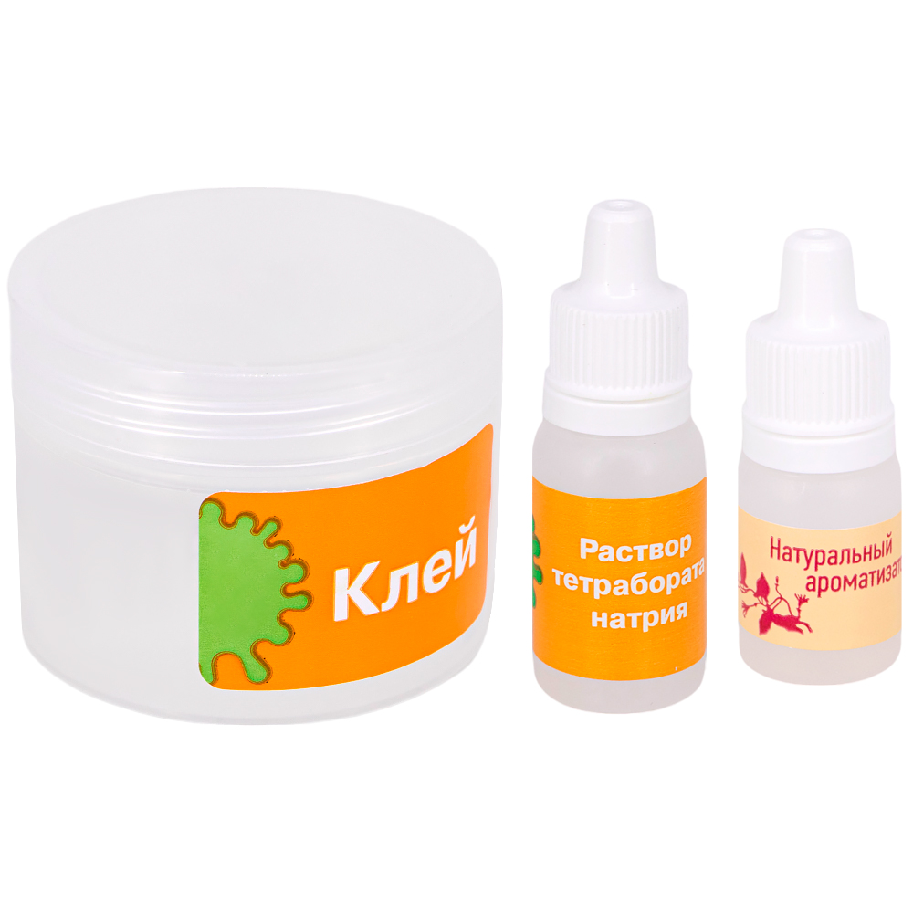 Комплектация: поливиниловый клей - 1 шт., тетраборат натрия - 1 шт., ароматизатор - 1 шт., палочка для размешивания - 1 шт., перчатки - 1 пара, трубочка - 1 шт., светящийся порошок - 1 уп., баночка - 1 шт.
