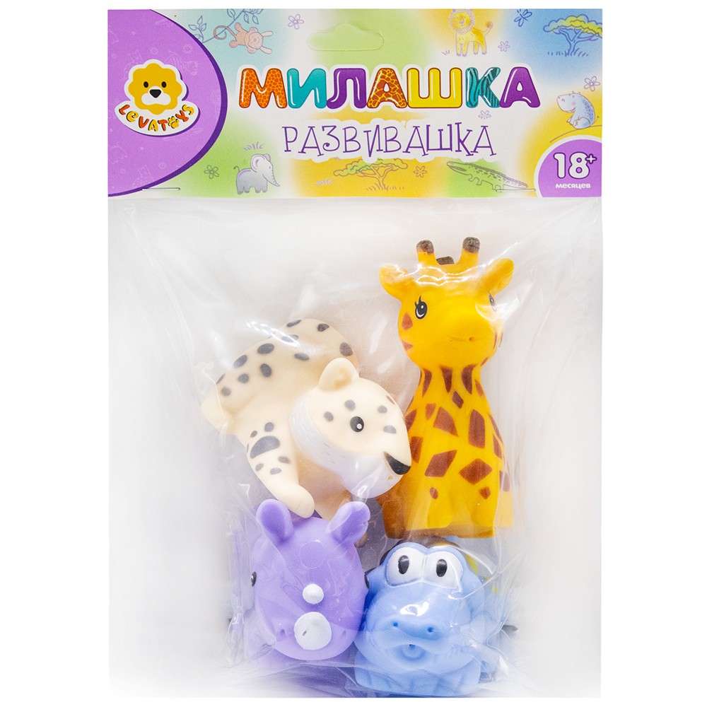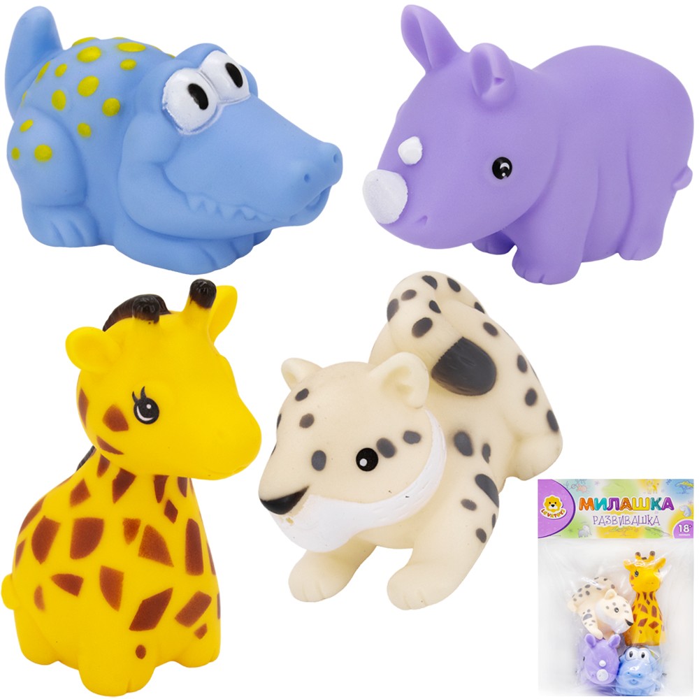 Комплектация: 4 резиновые фигурки (жираф, носорог, крокодил, леопард)
