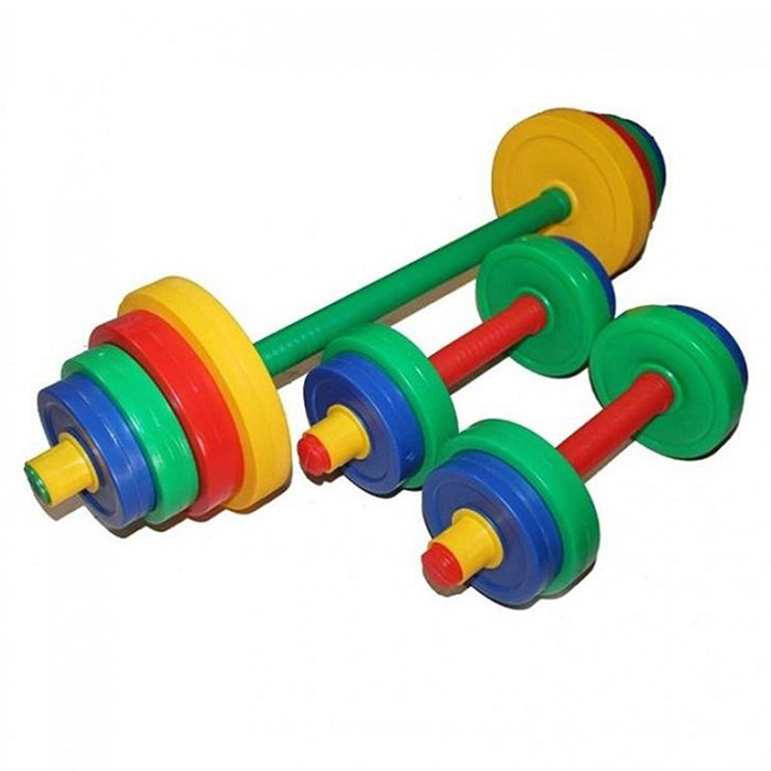 Спортивный набор, состоящий из гантели и небольшой штанги, идеально подойдет для маленького будущего спортсмена.