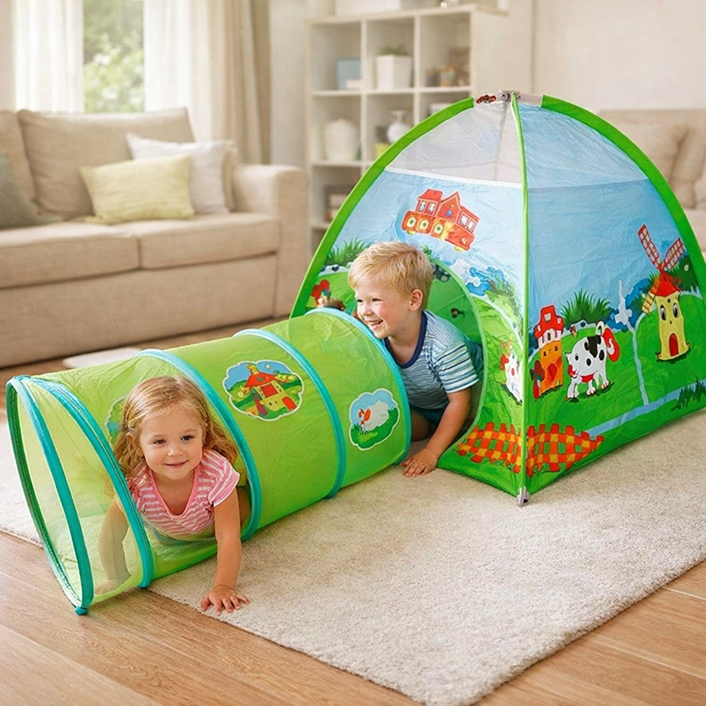 Оригинальный детский игровой домик станет отличным подарком для ребенка. Это хорошая игровая площадка как для одного, так и для целой компании детей. Этот домик имеет форму палатки, а также в комплект входит труба, которая может служить входом, а также использоваться для соединения с другим домиком. Домик можно использовать как в помещении, так и на природе, он легко складывается, обладает компактными размерами.Также может использоваться в качестве сухого бессейна для наполнения его пластиковыми цветными шарами. Подходит и для детских учреждений.