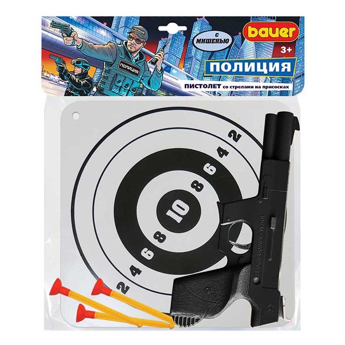 Комплектация: пистолет - 1 шт., мишень - 1 шт., стрелы на присосках - 3 шт.Материал: пластик