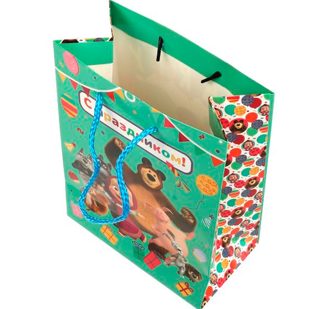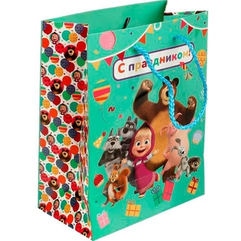 Плотный цветной пакет с ярким принтом позволит разместить подаки на любой случай.