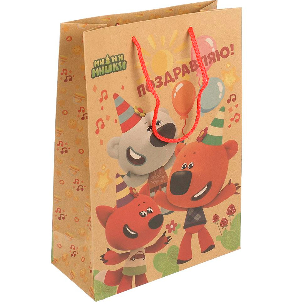 Плотный цветной пакет с ярким принтом позволит разместить подаки на любой случай.