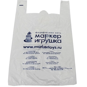 Прочный полиэтиленовый пакет-майка предназначен для быстрой упаковки товаров в магазине и переноске их. Пакет декорирован принтом с логотипом магазина "Маркер-игрушка" и адресаи магазинов в различных городах. Выдерживает вес до 12 кг.