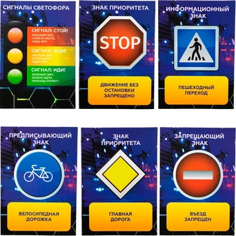 В комплекте идут двусторонние карточки. На одной стороне изображены ПДД, а на другой – часть изображения. Если собрать, как пазл, все карточки, то получится большая картинка.