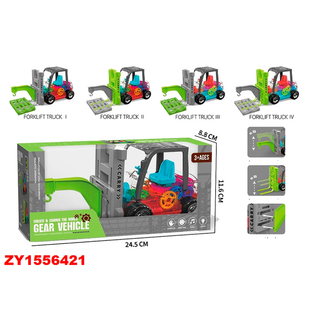 Размер упаковки: 24,5*8,8*11,6 смФункционал: инерционный механизм, прозрачный корпус, внутри цветные шестеренки, подвижные элементы, свет, звук