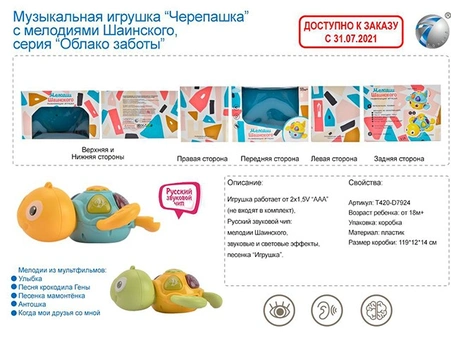 • Оригинальная яркая игрушка-черепашка предназначена для активных игр и развития мелкой моторики и координации движений.