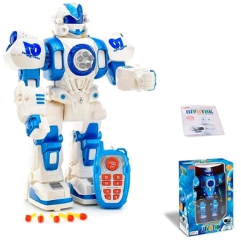 Размер упаковки: 25 х 13 х 36,5 смИгровой робот ШУНТИК на радиоуправлении, поет песни, танцует, знает сказки, игры, скороговорки, учит алфавиту, стреляет ракетами. Двигает головой, туловищем, руками, ходит вперед, назад, поворачивается направо-налево. Можно утановить время и будильник. Яркая динамичная подсветка