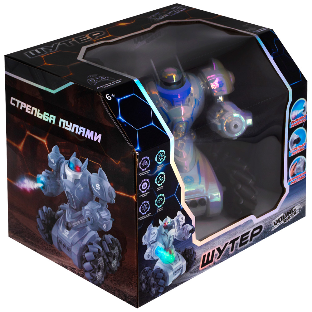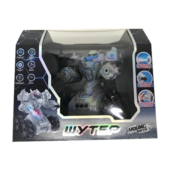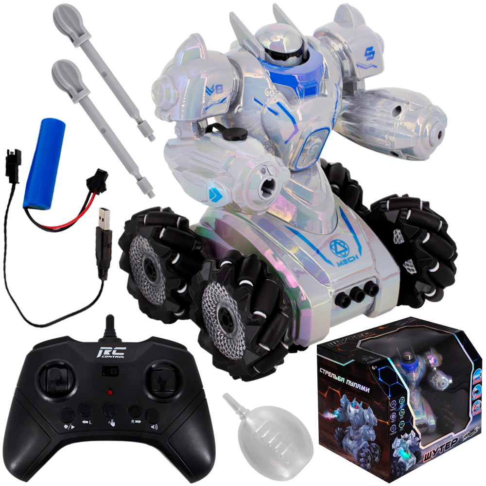 Комплектация: робот - 1 шт, пульт управления - 1 шт, пули - 2 шт, аккумулятор - 1 шт, кабель для зарядки - 1 шт