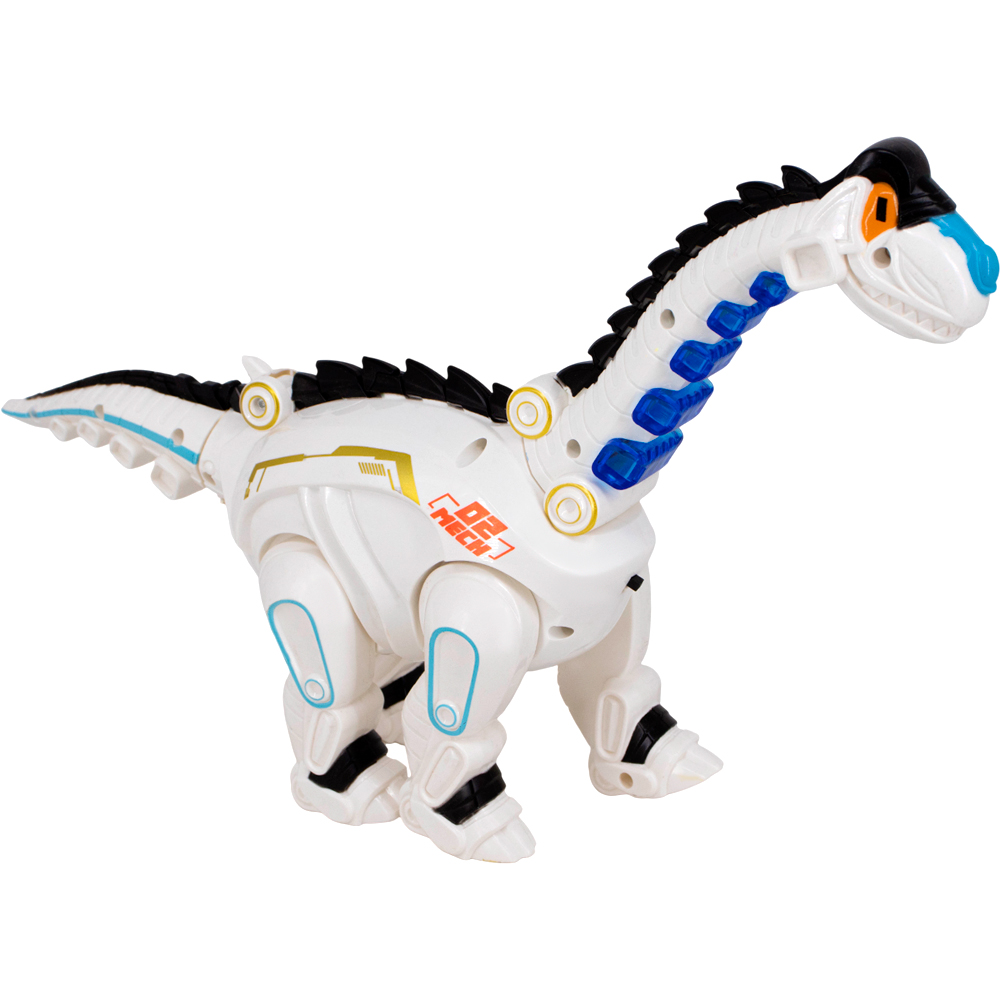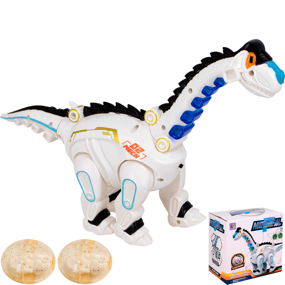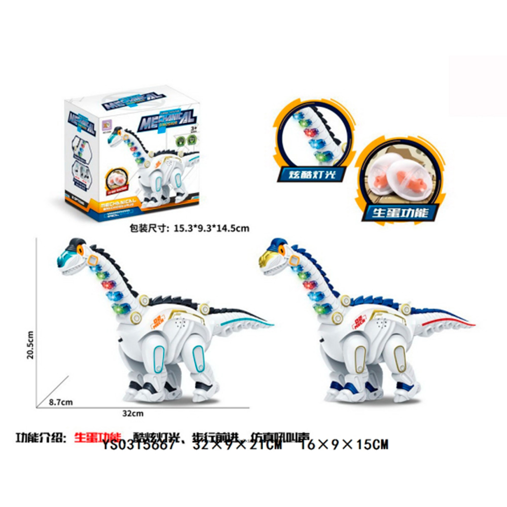 У динозавра подвижные лапы, ходит, рычит, мигают цветные огоньки.