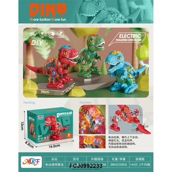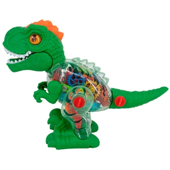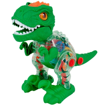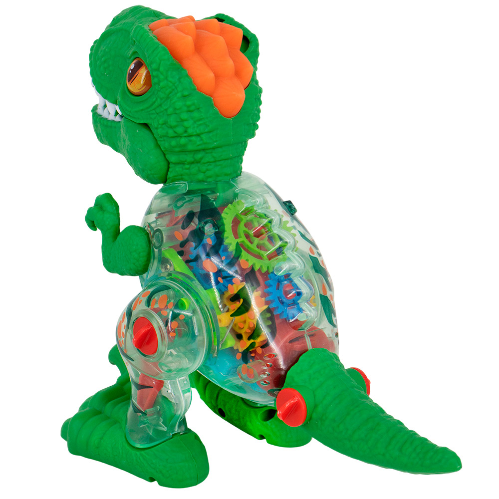У динозавра подвижные лапы, ходит, рычит, мигают цветные огоньки. Корпус прозрачный, видно, как при движении внутри крутятся цветные шестеренки.