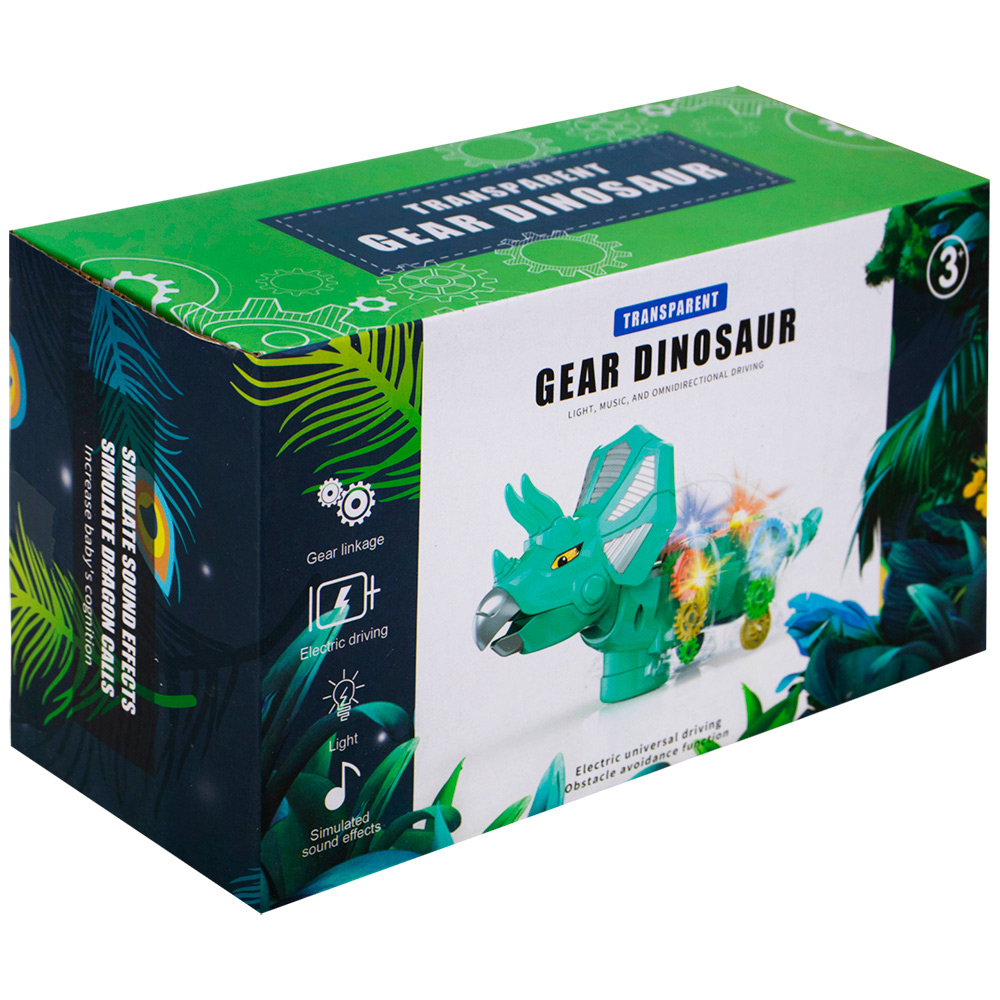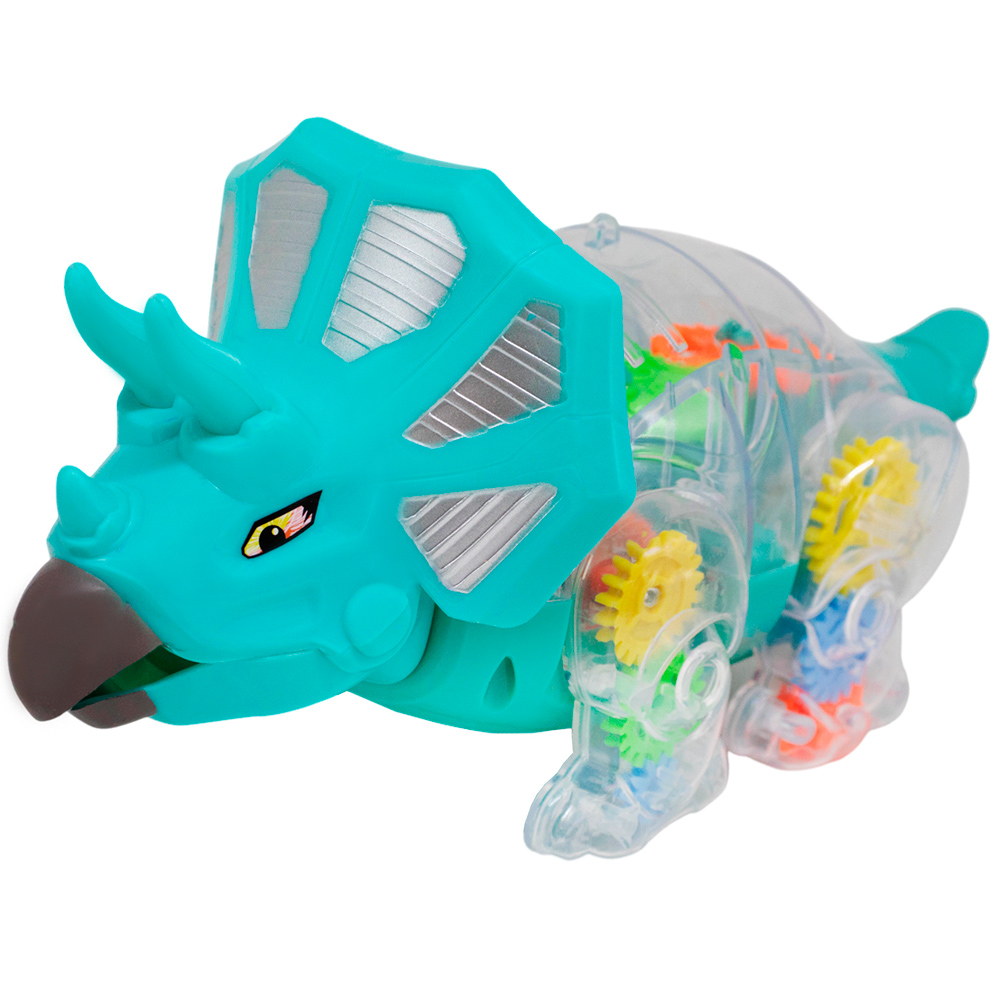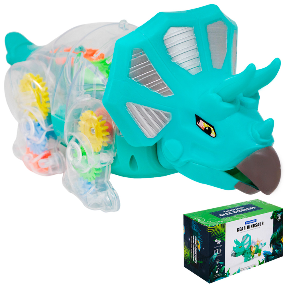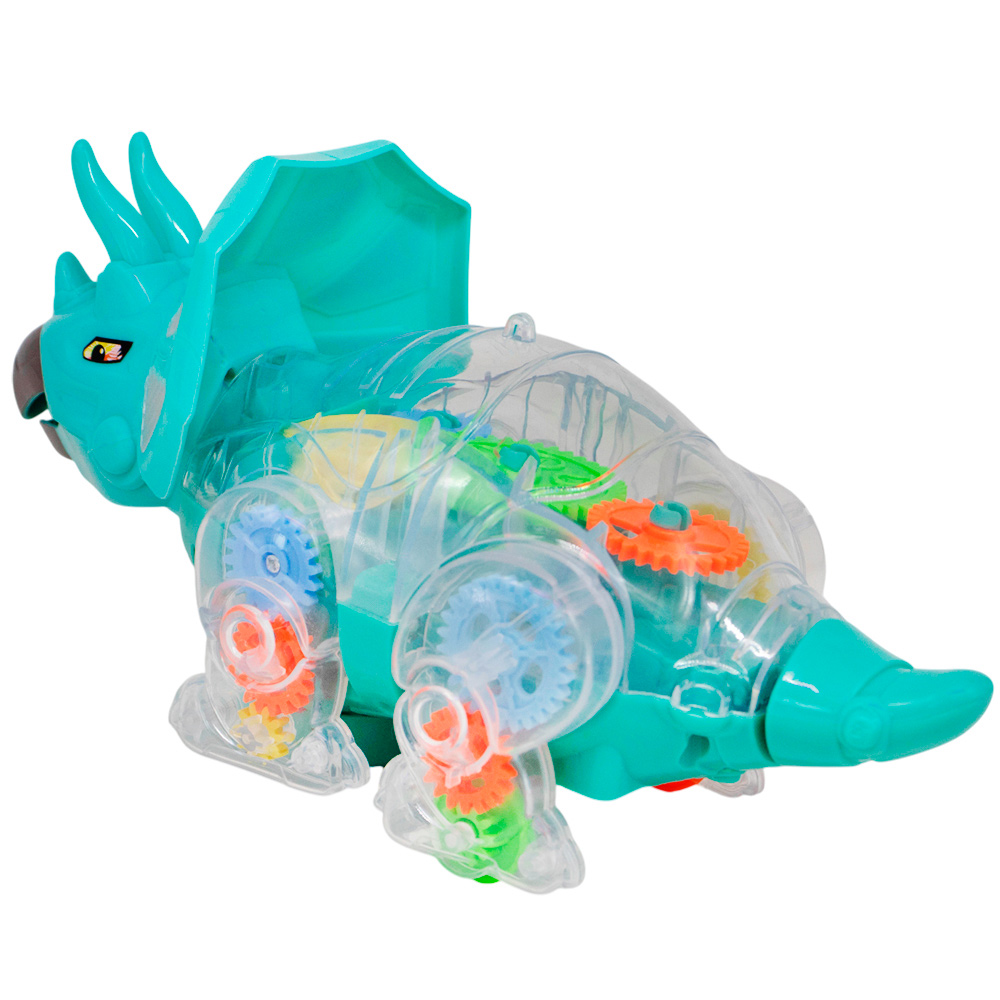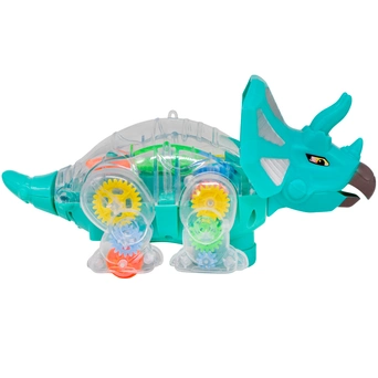 У динозавра подвижные лапы, ходит, рычит, мигают цветные огоньки. Корпус прозрачный, видно, как при движении внутри крутятся цветные шестеренки.