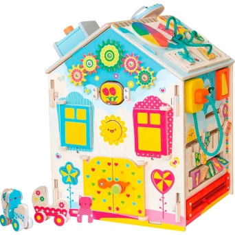 Функциональная логическая игрушка-бизидом оснащена подвижными цветными элементами.