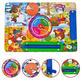 Бизиблорд представляет собой деревянную доску размером 20 х 29 х 1 см, на которой расположены множество подвижных элементов. Данный бизиборд познакомит малыша с понятием «время года». Благодаря ярким картинкам ребенок поймет, что такое «зима», «весна», «лето» и «осень», узнает названия месяцев и какая погода бывает.