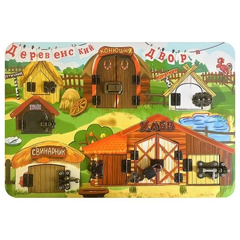 Размер упаковки- 44,7*30*1,2 смЗамочки - большая деревянная доска, на которой расположено 8 дверок, закрывающихся на различные защелки. Защелки на дверцах разные, есть крючки, задвижки и даже маленький навесной замочек. За каждой дверцей "живет" домашнее животное. Фигурки животных можно вынуть из доски и поиграть ими отдельно. Отдельной задачей будет найти каждому персонажу свое место и правильно вставить фигурку в отверстие. Для того, чтобы легче было вынуть фигурку из основания, рядом расположено отверстие для пальца. Вынув фигурку, можно увидеть изображения предметов, которые относятся к данному животному: еда, которую оно ест, продукты, которые оно производит или вещи, которые используются им (ошейник, седло...). Доска Замочки Деревенский двор разовьет мелкую моторику рук ребенка (при открывании различных замков), глазомер (при вкладывании вкладышей), познакомит с домашними животными.