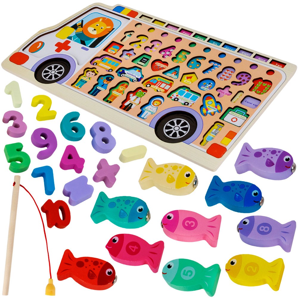 - в комплекте деревянная палочка с магнитом, при помощи которой можно разыграть игру в рыбалку;