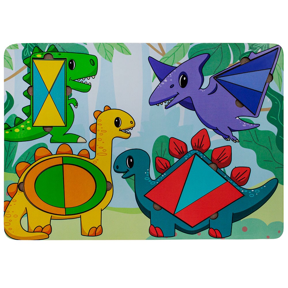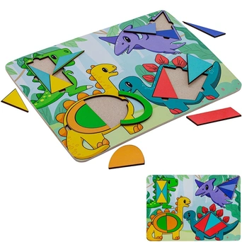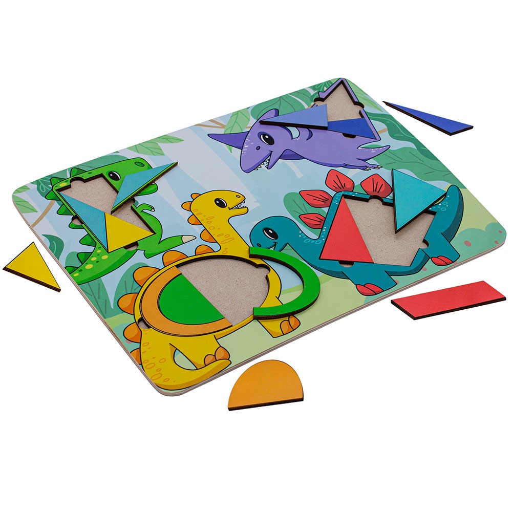 Игрушка состоит из деревянной основы с рамкой для вкладывания с изображениями динозавриков и набора фигурных деталей-пазлов.
