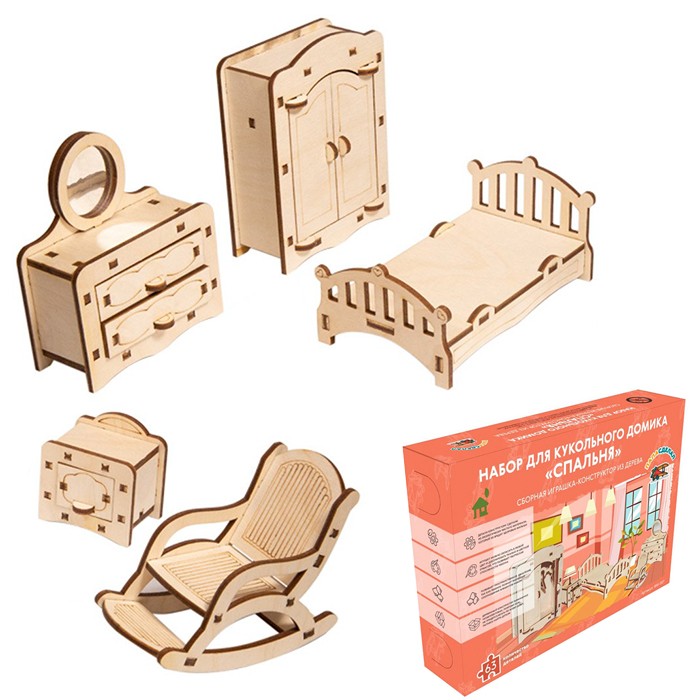 Комплектация: 63 детали из которых можно собрать игрушечную мебель (кроватка, кресло-качалка, шкаф, комод с зеркалом, тумбочка), инструкция по сборке