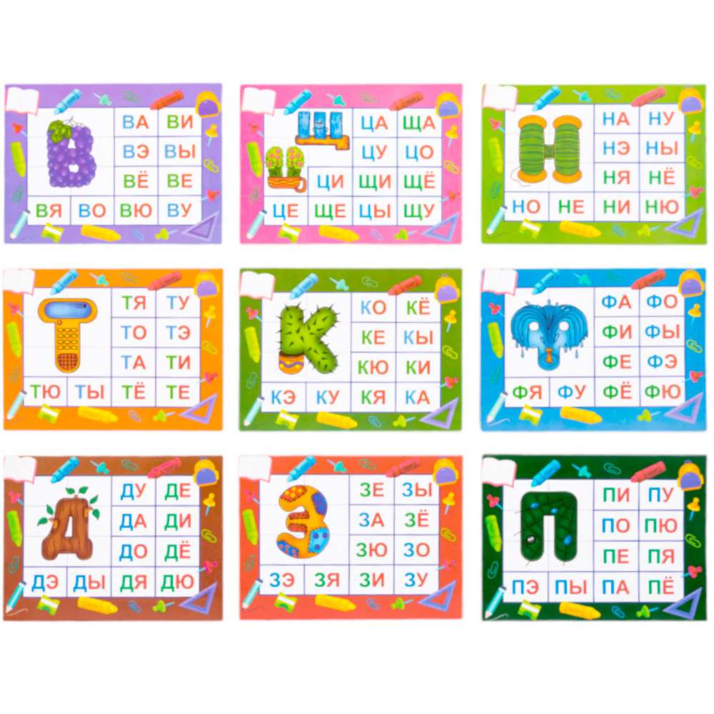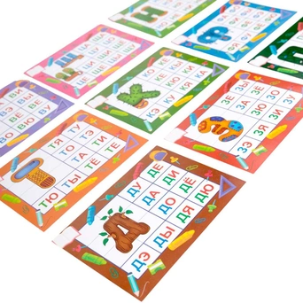 Комплектация: карточки - 9 шт, деревянные фишки со слогами - 180 шт, мешочек - 1 шт
