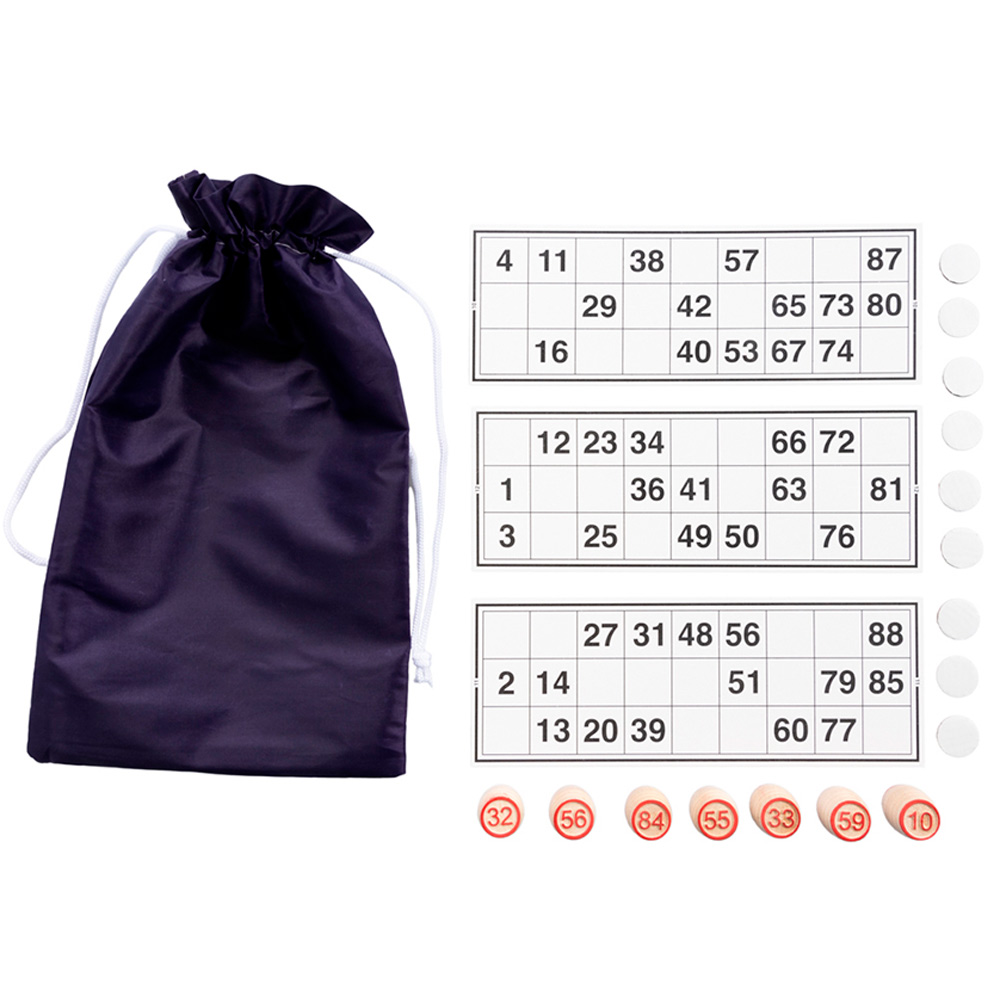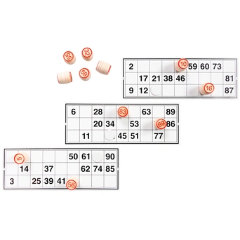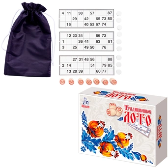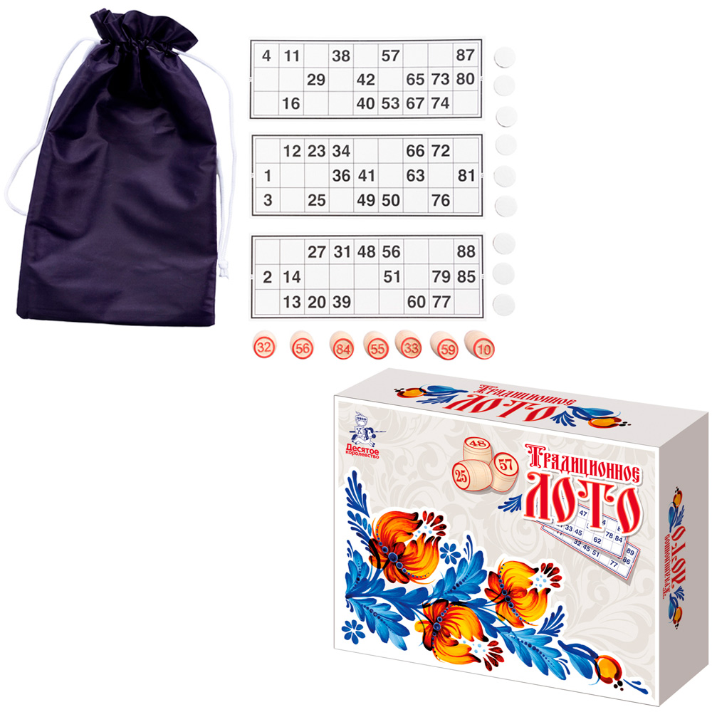 Комплектация: карточки - 24 шт, жетоны - 96 шт, мешок - 1 шт, бочонки - 90 шт
