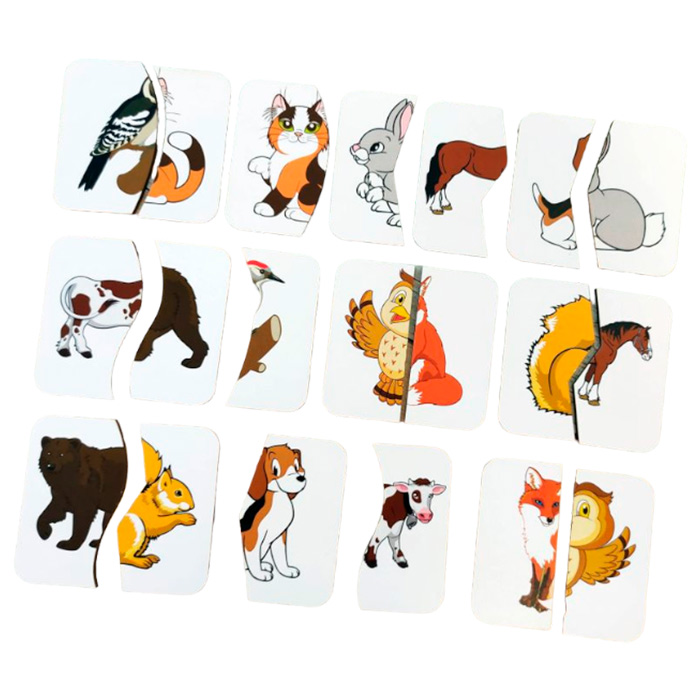 Картинки-половинки на пазле яркие и реалистичные, сопровождены надписями на русском и английском языке.