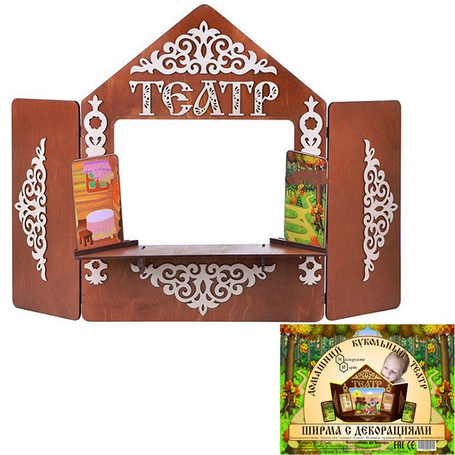 Деревянная ширма - это игра-конструктор. Из деревянных деталей можно собрать декорацию для домашнего спектакля, а затем раскрасить ее красками, фломастерами или карандашами. К ширме также прилагаются две популярных декорации - лес и изба, их тоже можно раскрасить на свой вкус. С такой замечательной ширмой настоящий кукольный театр можно организовать как дома, так и в детских образовательных учреждениях. В комплект входит: ширма, декорации, 2 шт. лес, изба. Размеры готовой декорации: 70 х 55 см. Размер декораций: 12,5 х 20 см.