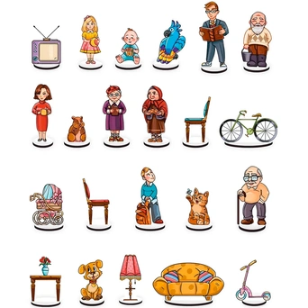 Набор включает в себя 22 фигурки членов семьи, домашних животных, предметы быта и мебели и спортивный инвентарь.