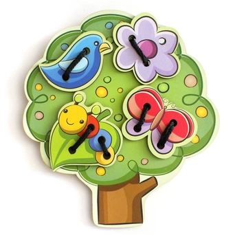 Шнуровка "Дерево" поможет малышу весело и с пользой провести время. Игра состоит из фигурки дерева, а также нескольких плоских картинок с изображением насекомых и птичек. Задача малыша - при помощи шнурка прикрепить фигурки к кроне дерева. Это увлекательное занятие положительно скажется на развитии мелкой моторики ребенка, его сообразительности и усидчивости, а также поможет ребенку получить навык шнурования, который будет необходим в повседневной жизни.