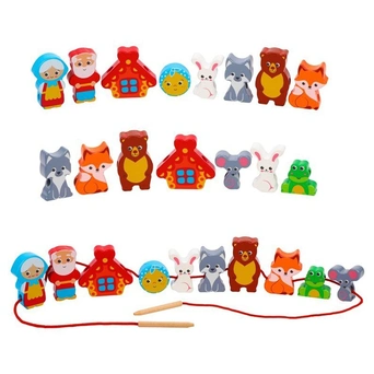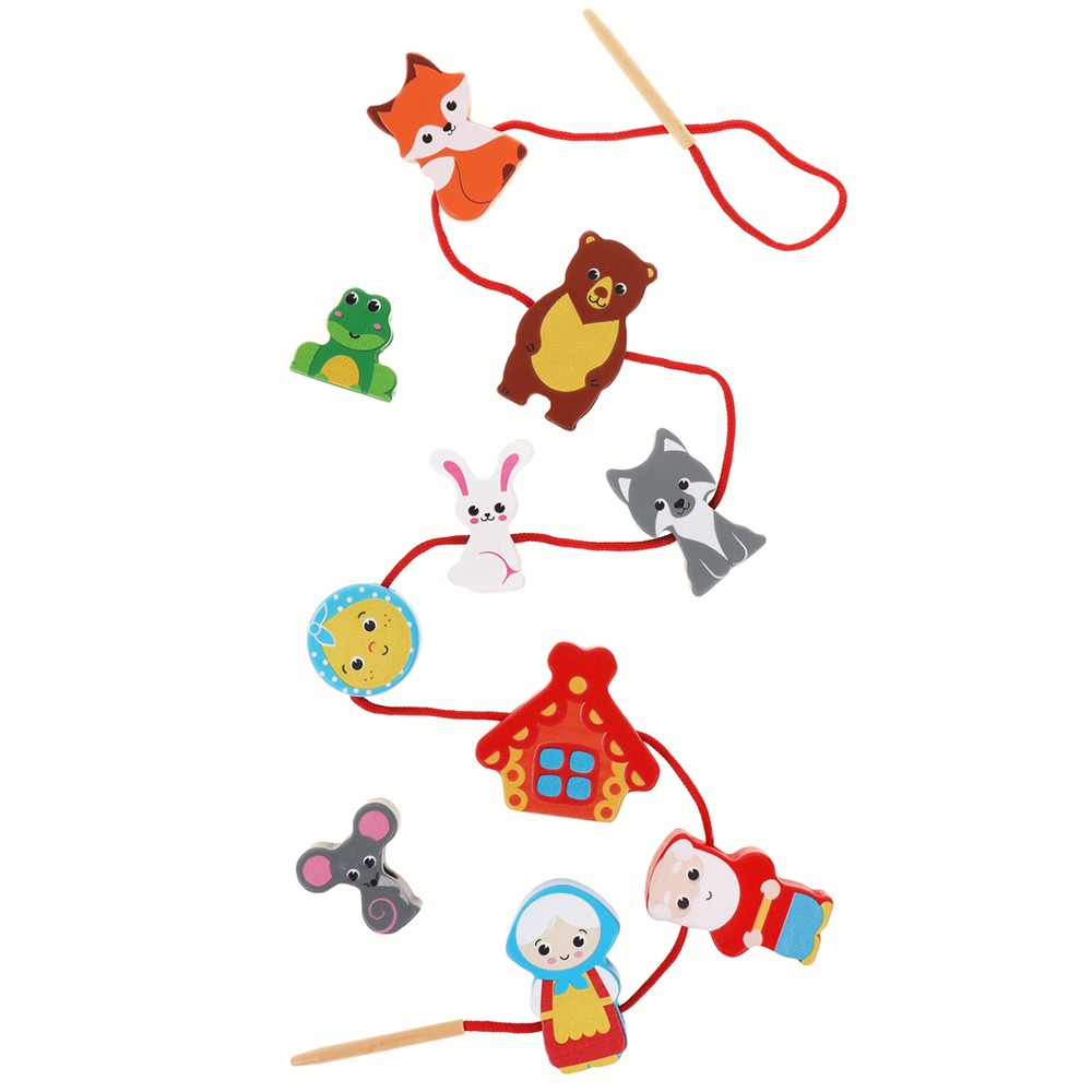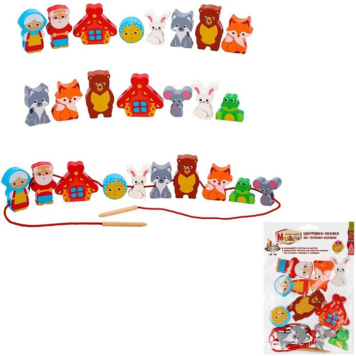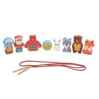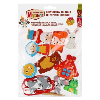 Цель игры: нанизать на шнурок все разноцветные бусинки, выполненные в виде персонажей популярных детских сказок «Теремок» и «Колобок».
