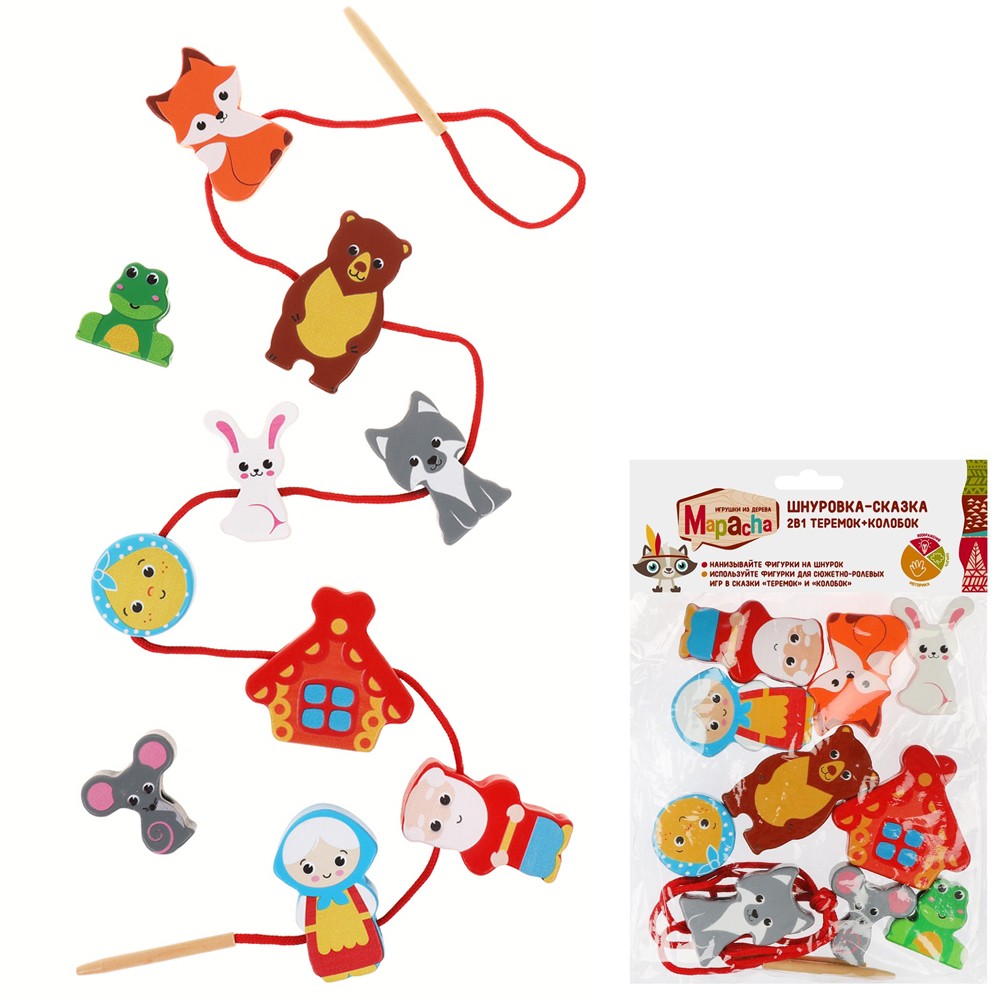 Деревянная игрушка Шнуровка-сказка Теремок и Колобок 2 в 1 - это очень интересная и занимательная игра, которая привлечет внимание малыша!