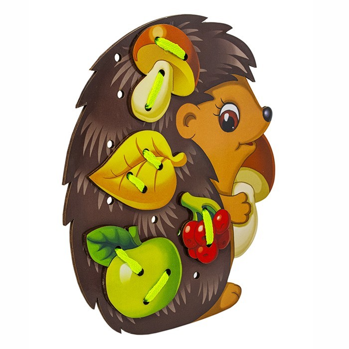 Комплектация: деревянная основа в виде ёжа, деревянные детали для шнурования – 4 шт., шнурок – 1 шт.