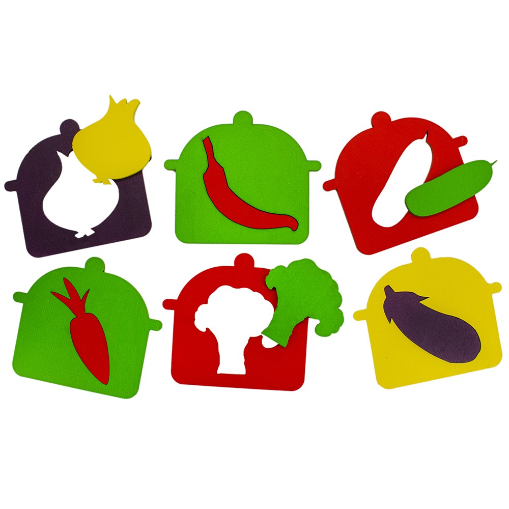 Досочки представлены в виде разноцветных кастрюлек, в которых содержаться яркие пазлы-вкладыши в виде овощей и фруктов. В комплект входит удобная деревянная коробочка для хранения вкладышей.