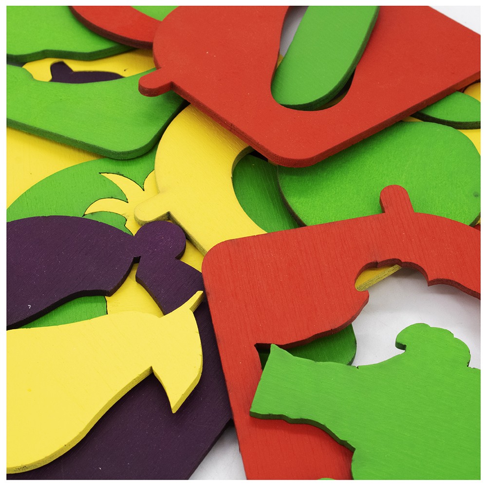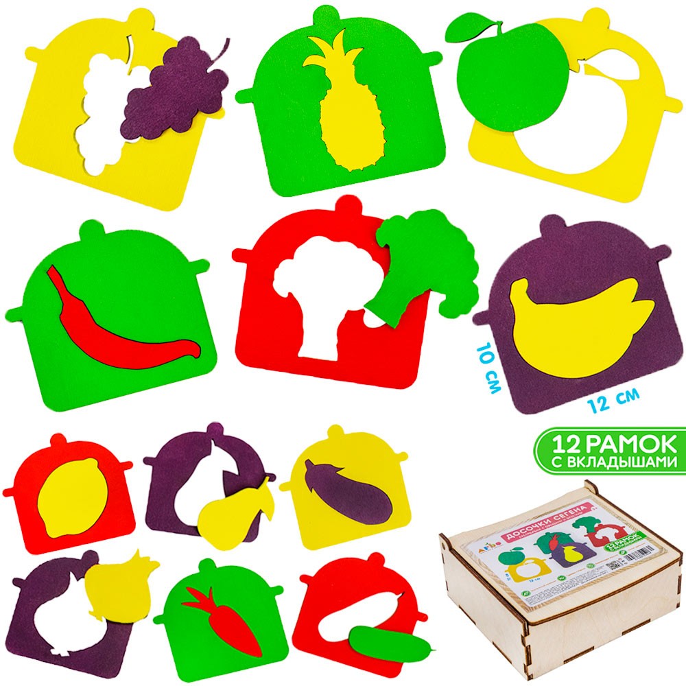 Комплектация: деревянная коробочка (12,5 х 11,2 х 5,4 см), 12 вкладышей (6 овощей и 6 фруктов)