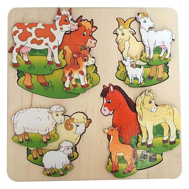Развивающая доска "Домашние животные" - это полезная и увлекательная игрушка для малышей, которая поможет ребенку получить множество новых знаний. В комплект входит рамка с отверстиями, а также 12 вкладных элементов в виде четырех разных семейств, обитателей фермы - коров, коз, барашков и лошадей. Каждая семейка состоит из мамы, папы и детеныша - рассматривая фигурки, ребенок познакомится с понятием "большой-средний-маленький", узнает название и внешний вид животных, потренирует навыки логики, зрительного восприятия, мелкой моторики и сообразительность. Все элементы изделия выполнены из экологически чистого материала - дерева, хорошо отшлифованы и окрашены безопасными нетоксичными красками.