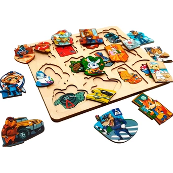 Деревянная игра состоит из основы и различных фигурных элементов, которые нужно располагать по принципу рамок и вкладышей.