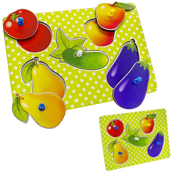 С помощью такой игрушки можно придумать множество занимательных игр. Например, попросить малыша назвать овощи, которые он видит на деревянной досочке, и придумать истории. Также, ребёнок сможет играть самостоятельно. Ему будет интересно вынимать вкладыши в виде игрушек и вставлять в ячейки, держа за цветную кнопочку.