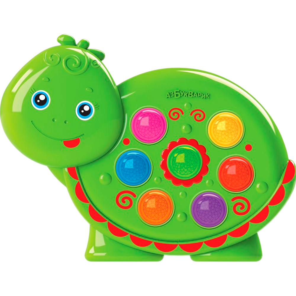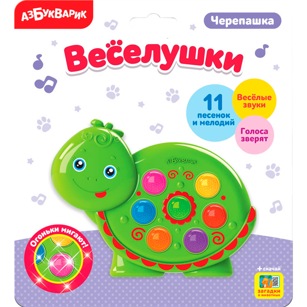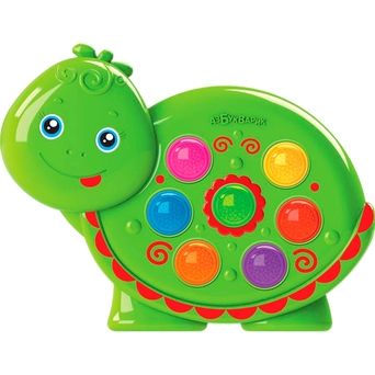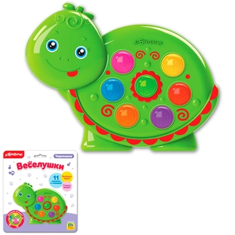 Яркая черепашка привлечёт внимание малышей весёлыми звуками, мигающими огоньками, любимыми песенками и мелодиями ("Я черепашка-крошка", "Топ-топ, топотушки", "Тихоня черепаха", "Дождик", "Каравай", "Чики-чики-чикалочки", "Песенка про кузнечика", "Калинка", "Два весёлых гуся", "Трик-трак", "Весёлая полька")!