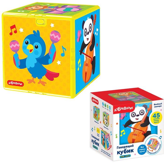Говорящий кубик "Веселый зоопарк" - развивающая игрушка, которая познакомит малыша с разными зверюшками, названиями музыкальных инструментов и их звучанием. У кубика 6 активных граней, при вращении граней можно прослушать 45 разных звуков, мелодий и стихов, которые помогут потренировать память, слух и внимание малыша. Приятным дополнением к игре станет QR-код для скачивания интерактивной азбуки к смартфону или планшету в приложении "Азбукварик".