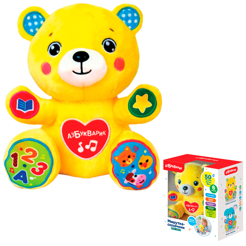 Сказочник умеет разговаривать голосами зверят и расскажет ребёнку 6 сказок: «Курочка Ряба», «Три медведя», «Солнышко», «Пузырь, соломинка и лапоть», «Репка», «Гав-гав». Он споет 4 обучающие песенки про алфавит, счет, формы и цвета, 6 веселых песенок о зверятах.
