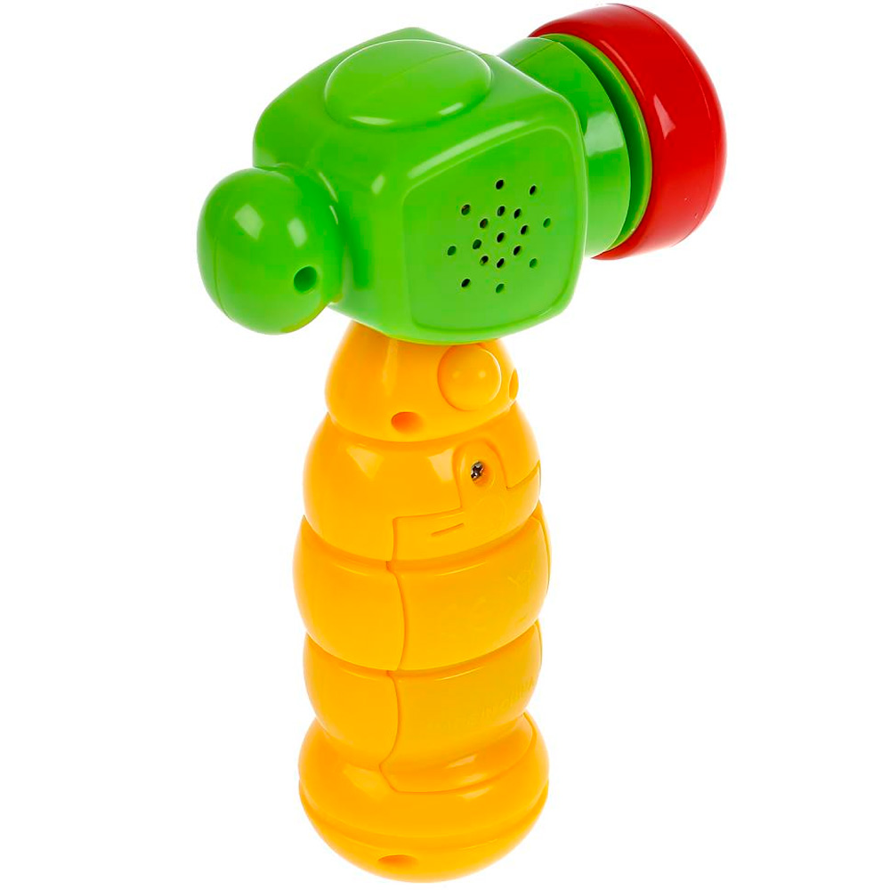 Оригинальная яркая игрушка предназначена для активных игр и развития мелкой моторики и координации движений. Яркая расцветка развлечет малыша и привлечет его внимание. Игрушка учит пониманию причинно-следственной связи, помогает тренировать моторику и координацию движений, восприятие формы и цвета. Веселый молоточек издает забавные звуки. Молоточек крякает, если им стучать. Если его трясти, то расположенный внутри шарик будет греметь. Рифленая ручка обеспечивает надежный захват. Игрушка привлекает внимание и способствует развитию тактильного, зрительного и слухового восприятия малыша. Игрушки сделаны из прочного и безопасного материала.