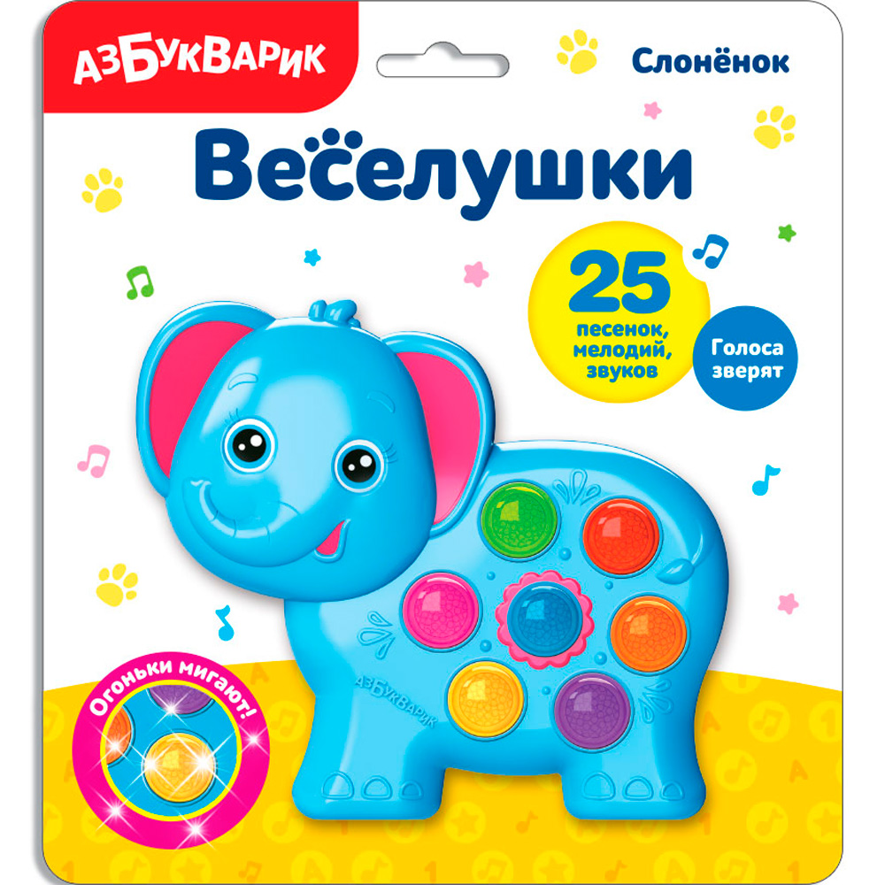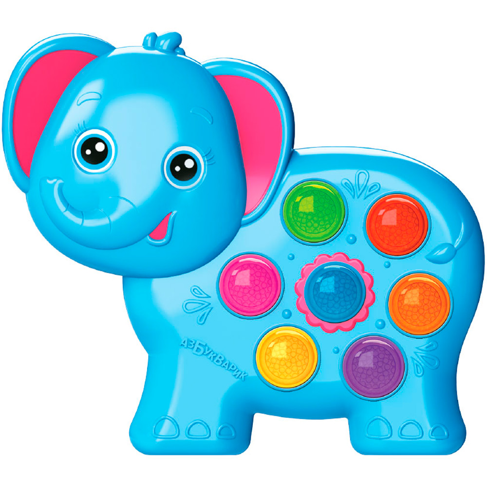 Веселая игрушка «Слонёнок» из серии «Веселушки» подарит вашему малышу море положительных эмоций, много веселья и хорошее настроение. Игрушка выполнена в форме слонёнка. Малыш с большим интересом будет нажимать на яркие кнопочки и слушать веселые, добрые песенки.