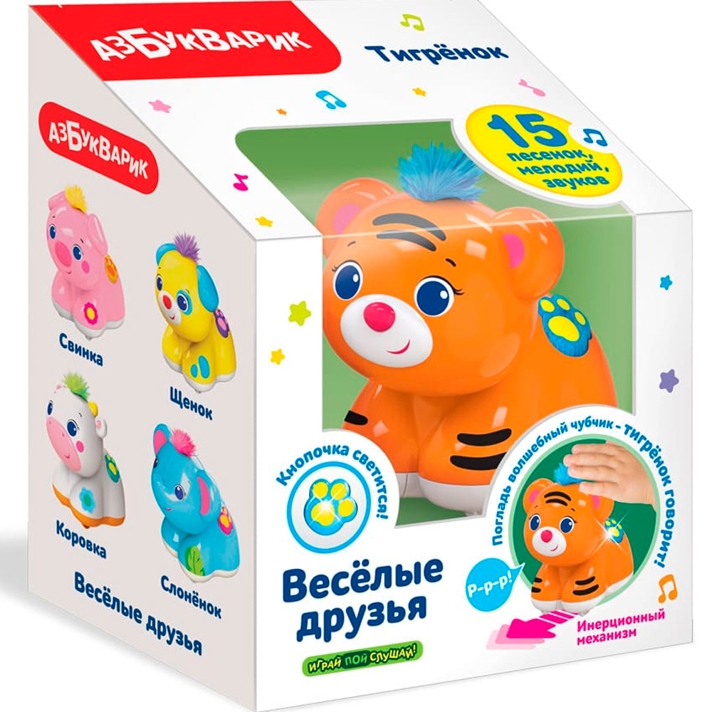 Милый тигренок с пушистым чубчиком приведет малыша в восторг. А чубчик у него – волшебный! Нужно просто его погладить – и тигренок заговорит! Нажимая на кнопочку, малыш послушает веселые песенки и мелодии («Озорной тигрёнок», «Приходи в зоопарк поскорей», «Чунга-чанга», «Арам зам зам», «Прятки»). А если погладить чубчик во время звучания – тигренок будет подпевать. В игрушке также есть инерционный механизм – зверюшка ездит не хуже машинки.