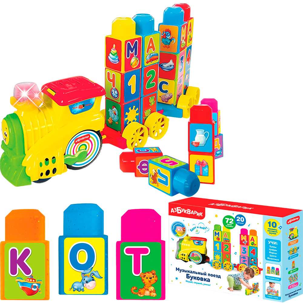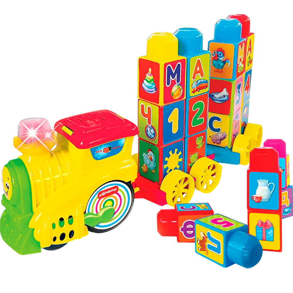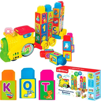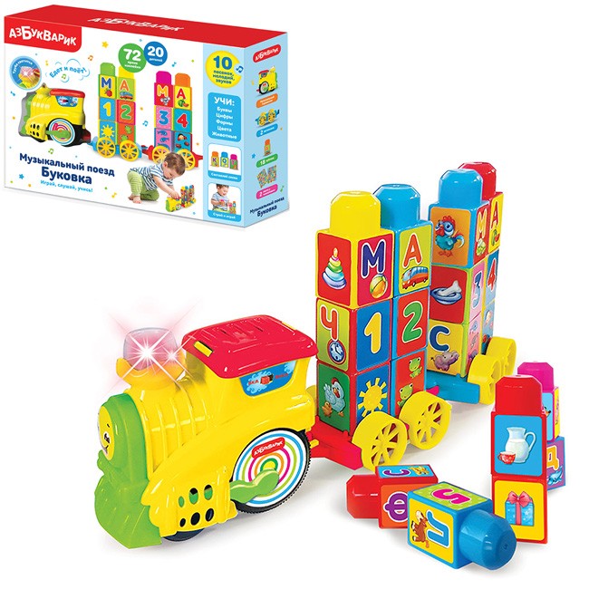 Комплектация: музыкальный паровозик, 2 вагончика, 18 кубиков и 72 яркие наклейкиМатериал: пластик, бумага